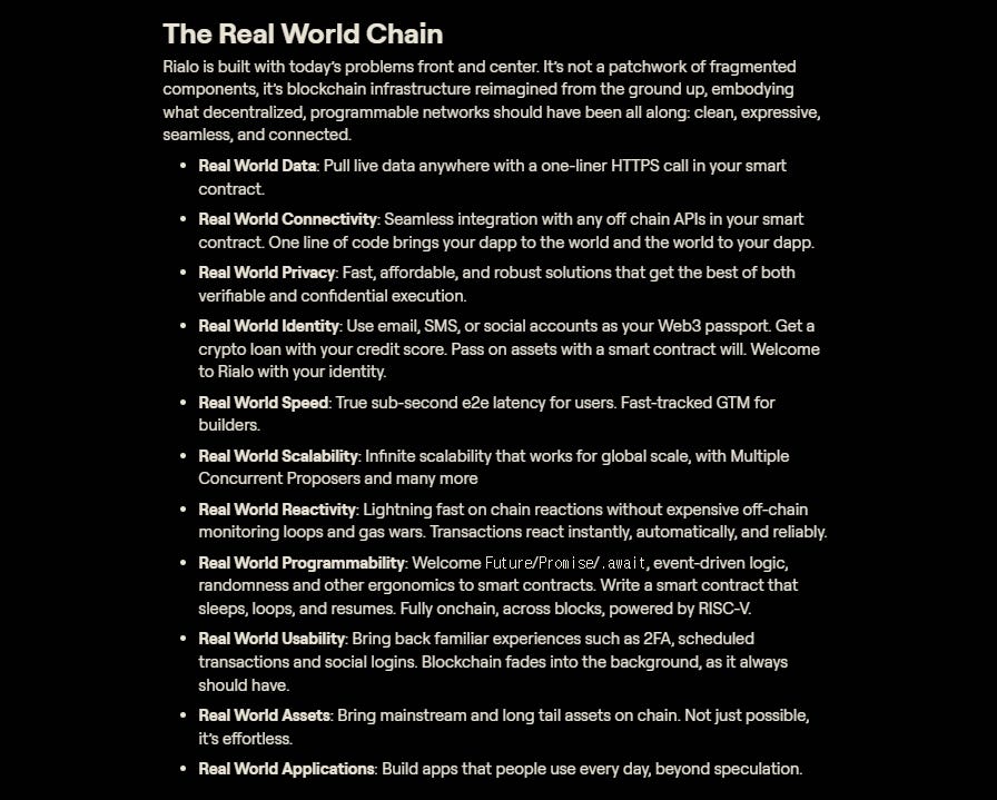Rialo는 자신들을 레이어1이라 부르기보다, 현실과 소통하는 첫 번째 풀스택 블록체인이라고 설명합니다. 현실 세계와 소통하는 블록체인이라는 슬로건답게, Rialo는 탈중앙화된 고성능 프로그래밍 네트워크로서 현실의 이벤트와 데이터를 직접 다룰 수 있도록 설계되었습니다. 쉽게 말해, Rialo는 지금까지 별도로 운영되던 웹2의 각종 기능(웹 요청, 데이터피드, 스케줄러 등)을 블록체인 속으로 통합함으로써, 개발자들이 현대적인 소프트웨어처럼 디앱을 만들 수 있게 하는 플랫폼입니다. 기존에는 불가능하던 것들을 가능하게 하겠다는 점에서, Rialo 팀은 이 프로젝트를 탈중앙 네트워크를 처음부터 다시 설계하고 재구축한다고 표현합니다.